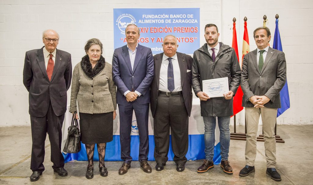 El Banco de Alimentos de Zaragoza entrega su premio “Amigos y alimentos” El galardón, que este año celebra su XXIII Edición, ha reconocido la colaboración del Grupo El Corte Inglés Zaragoza, 9 de noviembre de 2018.- El Banco de Alimentos de Zaragoza ha celebrado esta mañana la XXIII Edición de sus premios “Amigos y Alimentos” que distinguen anualmente a aquellas empresas o entidades que más han destacado en su apoyo a la Fundación. Este año el premio ha sido para el Grupo El Corte Inglés, representado por Javier Galdós, director regional en Aragón, Navarra y La Rioja quien ha recibido el galardón de la mano del Justicia de Aragón, Ángel Dolado. El acto ha contado en la presidencia también, además de José Ignacio Alfaro, Presidente del Banco de Alimentos de Zaragoza, con el Subdelegado del Gobierno en Aragón, José Abadía y el Director General de Mercazaragoza, Constancio Ibáñez. Entre los asistentes, representantes de entidades beneficiadas, patronos y voluntarios de la entidad, junto con representantes de empresas y entidades donantes, así como el Comandante de la Guardia Civil Felix Vallejo Peñafiel en representación del General y con el Tte Coronel Jimenez Trujillo, jefe del Grupo de Abastecimiento I/41, de la AALOG 41, cuerpos también colaboradores con el Banco de Alimentos. La entidad ha querido asimismo reconocer la especial dedicación a su trabajo diario de tres de sus voluntarias, a quienes se ha entregado una insignia de plata: Inmaculada Felices, Rosa Moreno y Lina Montesinos. Durante el pasado año la Fundación Banco de Alimentos de Zaragoza repartió 4 millones de kilos, entre los 247 Centros Asistenciales a los que atiende, abarcando 27.762 personas beneficiadas por su actividad. Todo ello a través de la labor desinteresada de 155 voluntarios fijos con los que cuenta y de las empresas y particulares donantes. De izquierda a derecha: Inmaculada Felices, voluntaria distinguida este año, Santiago Sánchez, Hermano Mayor de El Refugio en representación de las entidades beneficiadas; Constancio Ibáñez, Director General de Mercazaragoza; Ángel Dolado, Justicia de Aragón; Javier Galdós, Director Regional del Grupo El Corte Inglés; José Ignacio Alfaro, Presidente del Banco de Alimentos de Zaragoza; Rosa Moreno, voluntaria distinguida; José Abadía, Subdelegado del Gobierno en Aragón; y Lina Montesinos, voluntaria distinguida.